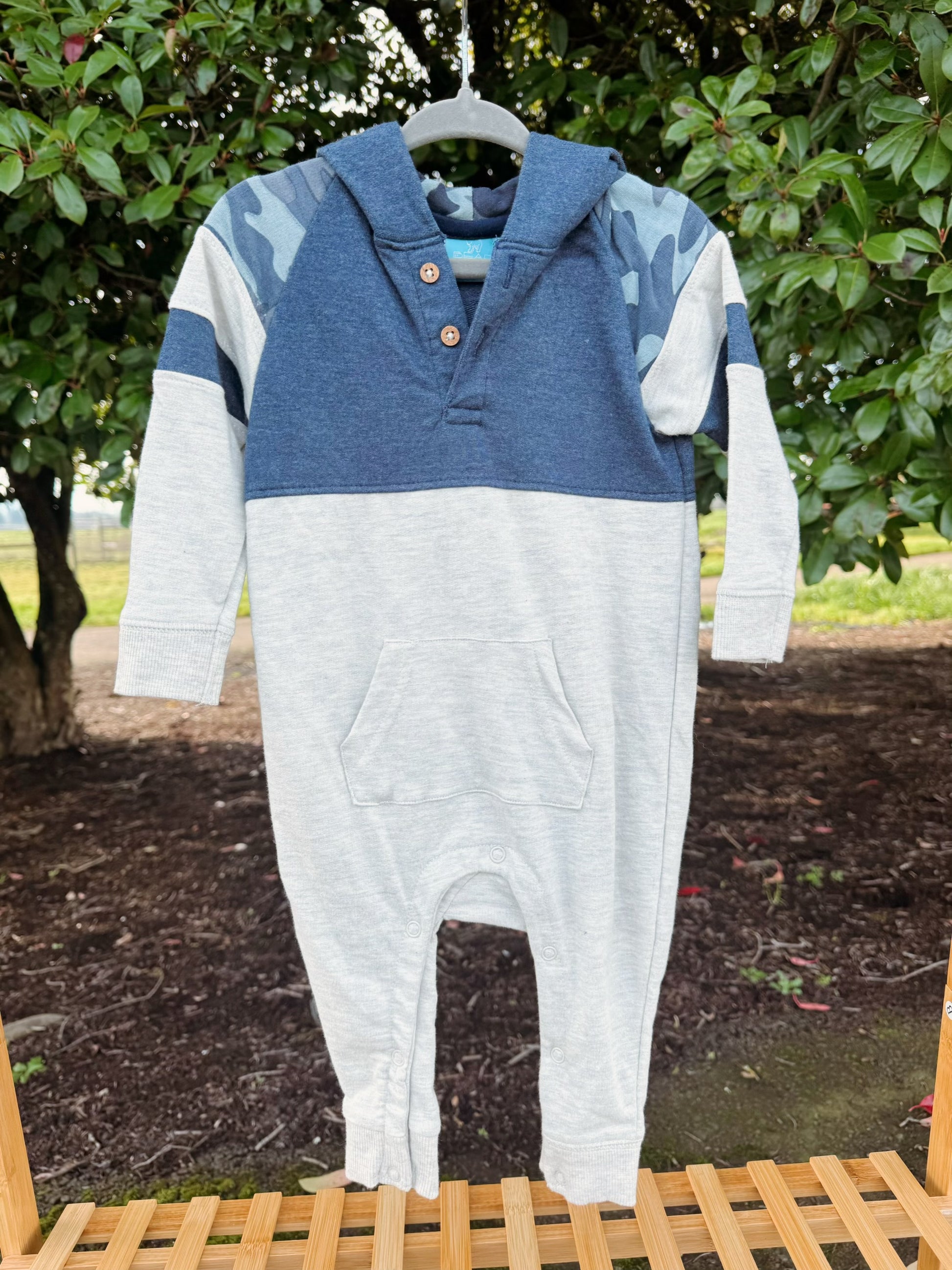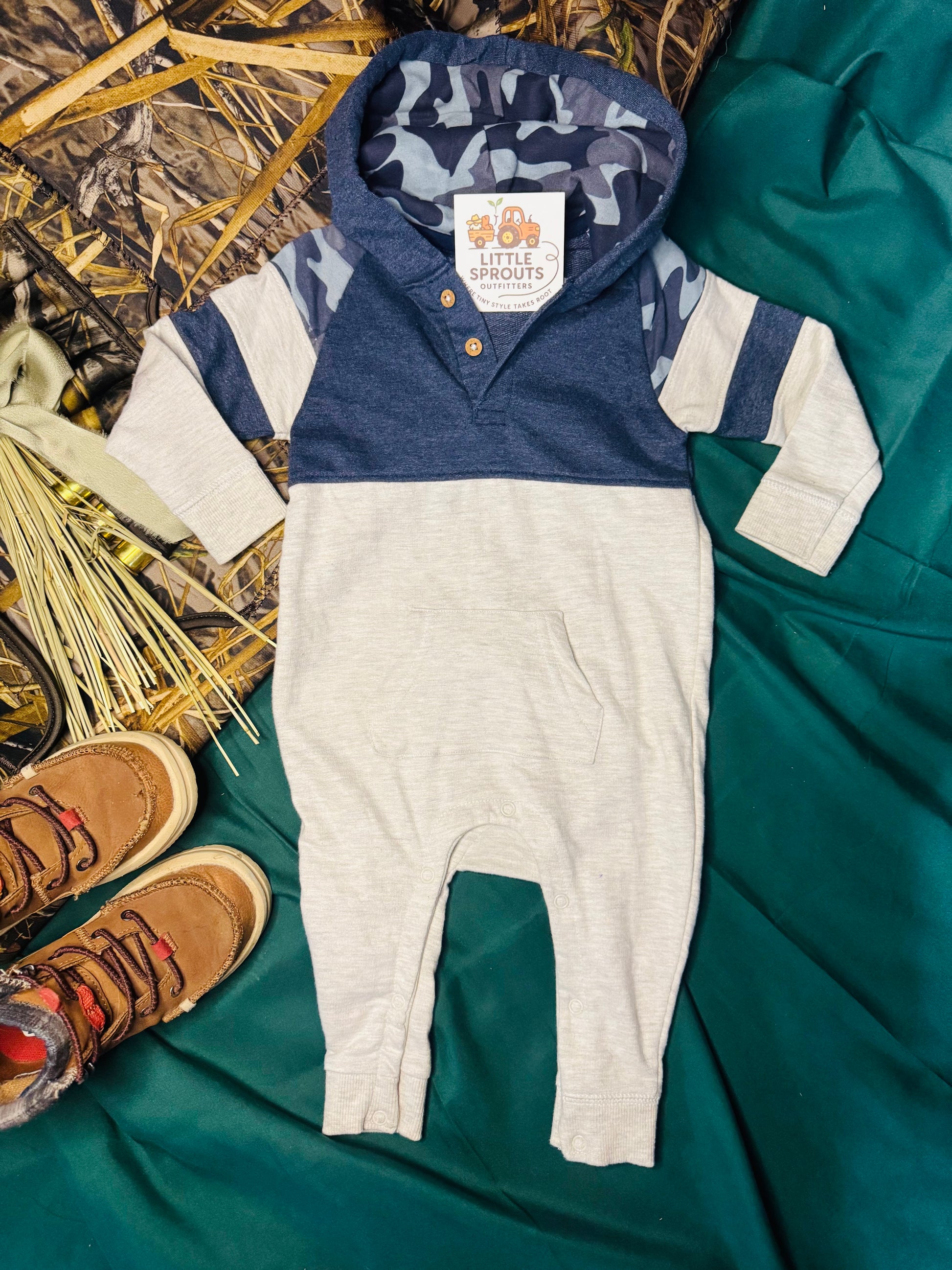 The Infant Hooded Romper is an easy, everyday essential for your littlest explorer. Made in a soft oatmeal color with a navy camo hood and matching chest stripe, this one-piece delivers cozy comfort with a touch of rugged, playful style.