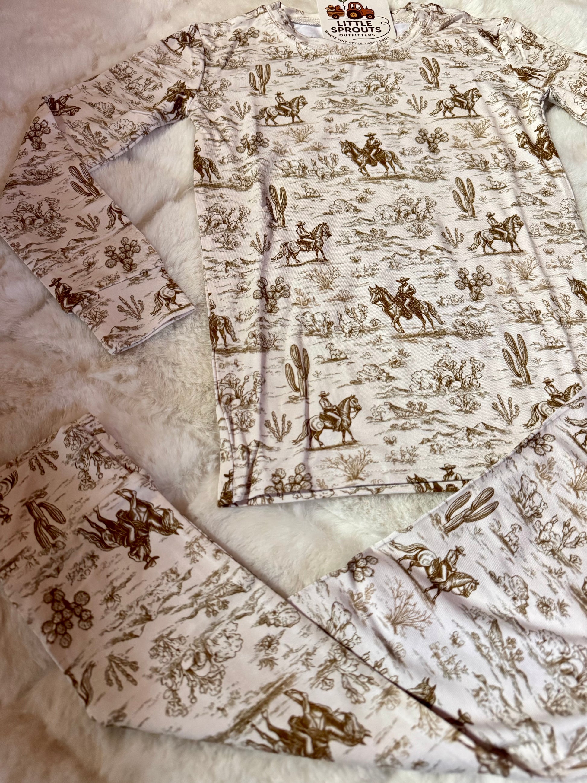 Cuddle up with western charm. The Cowboy Country 2-Piece Set wraps your little one in cozy comfort and cowboy spirit. Featuring hand-drawn cowboys riding across the range through sagebrush and cactus, this neutral ivory and brown print captures the heart of the open West in earthy, timeless tones.