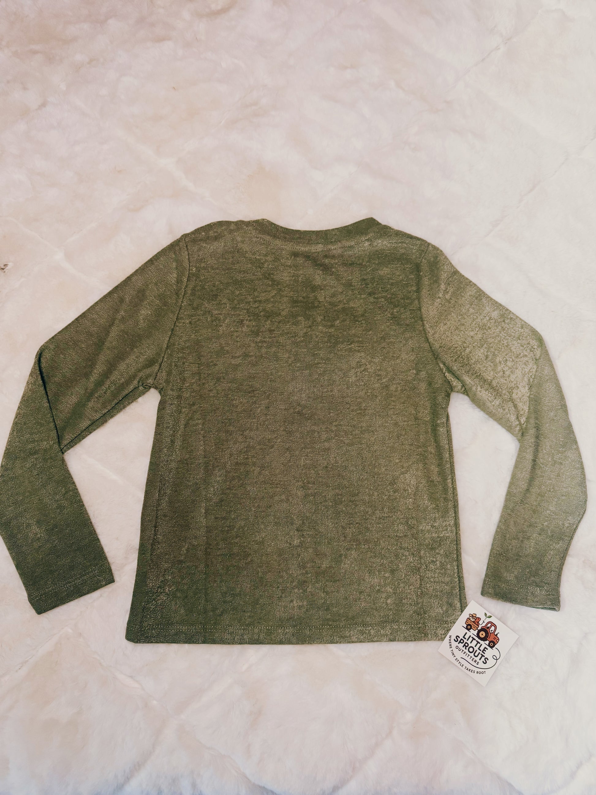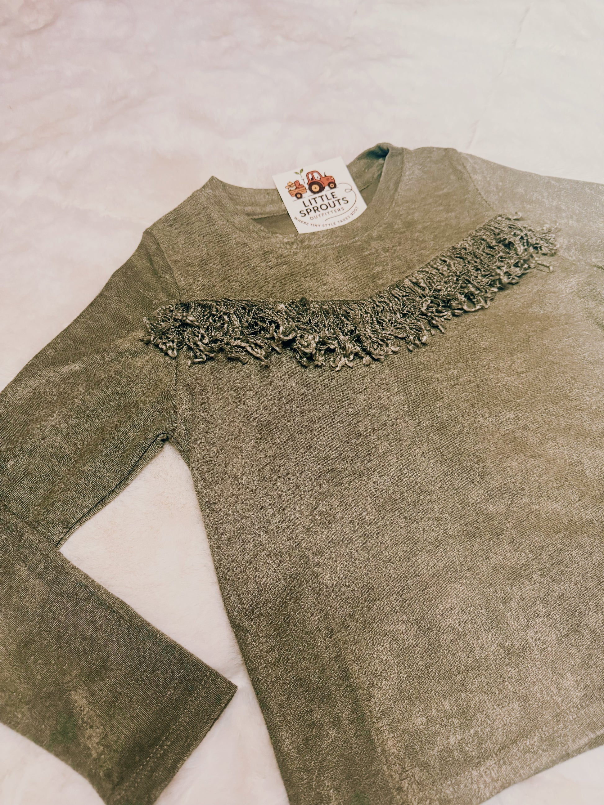 The Light Olive Fringe Top brings a touch of western flair to everyday wear. With a soft scoop neckline, long sleeves, and playful fringe detail across the chest, this top adds the perfect mix of comfort and style to your little one’s wardrobe.